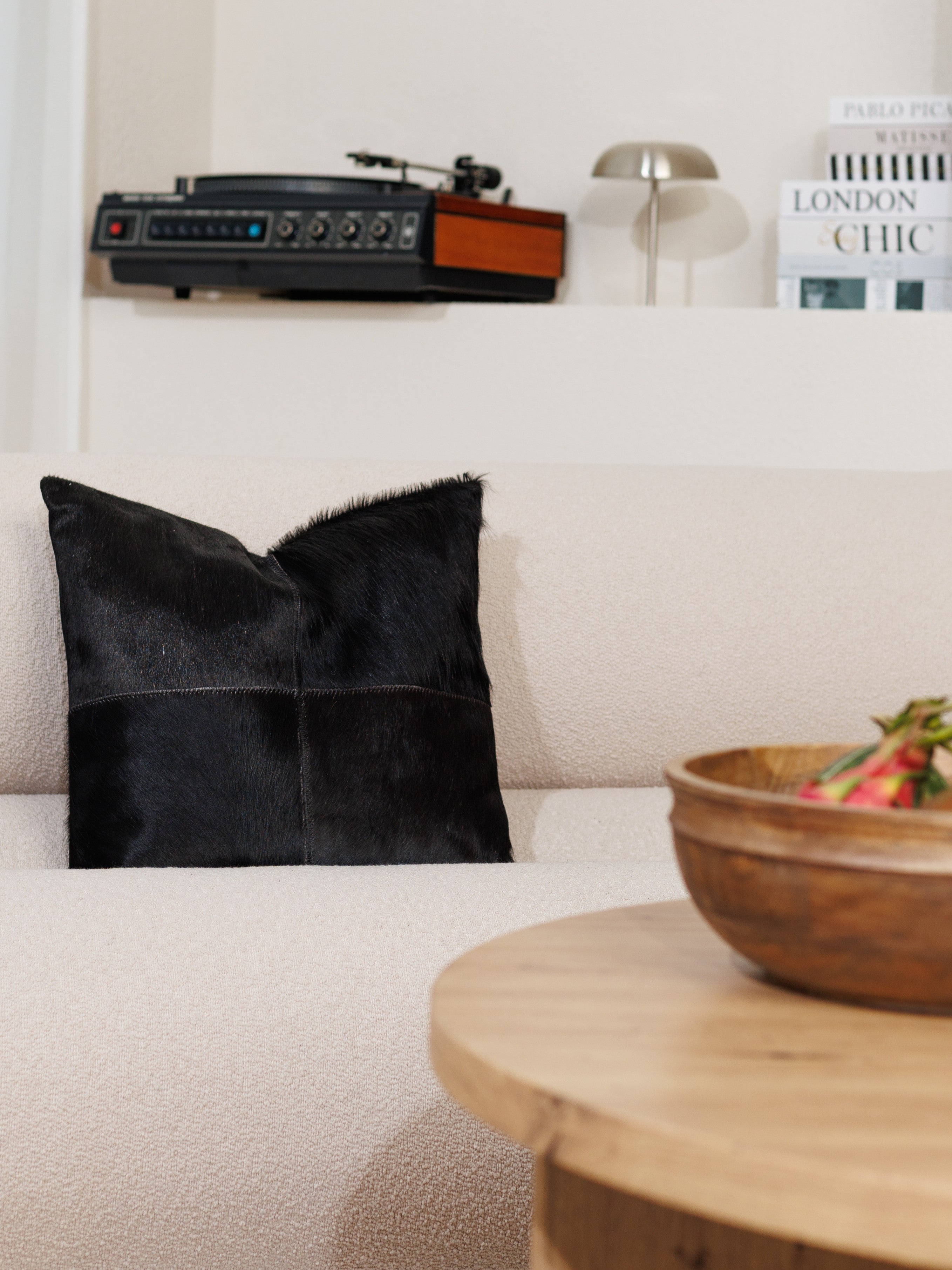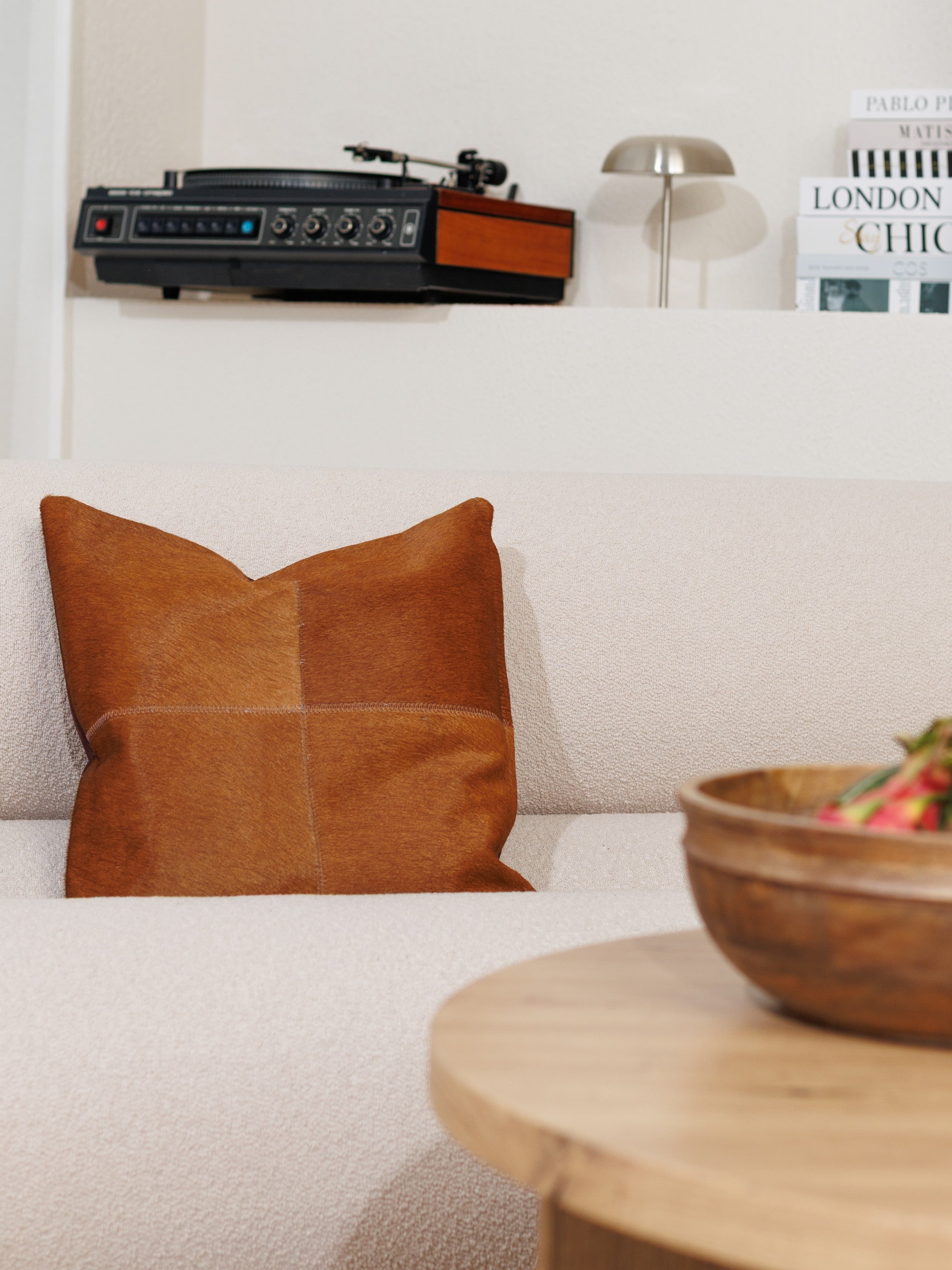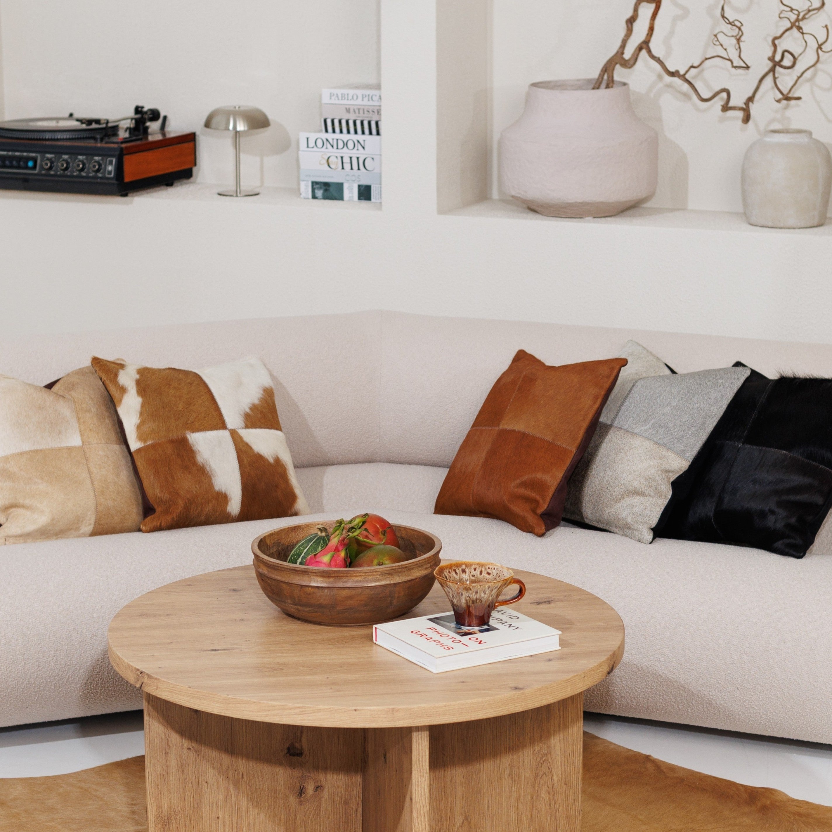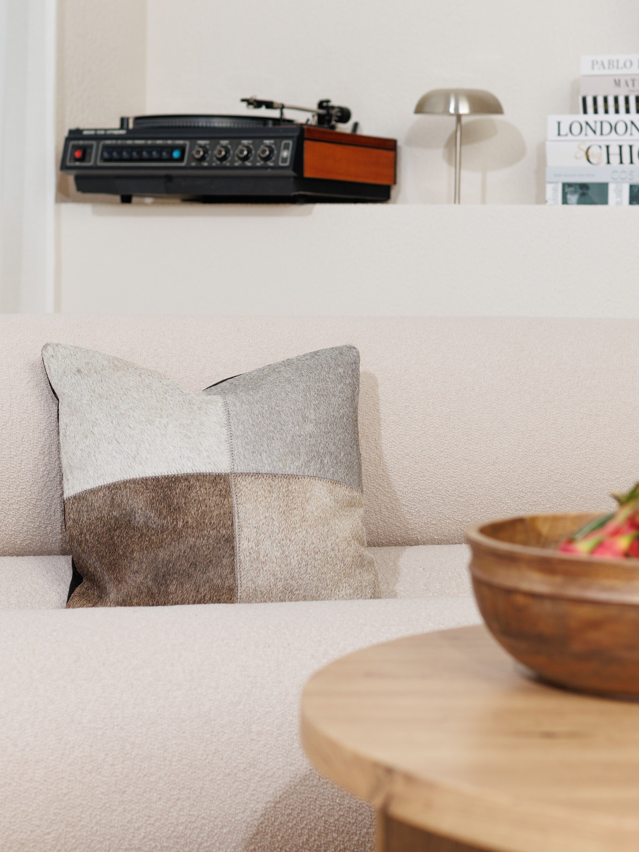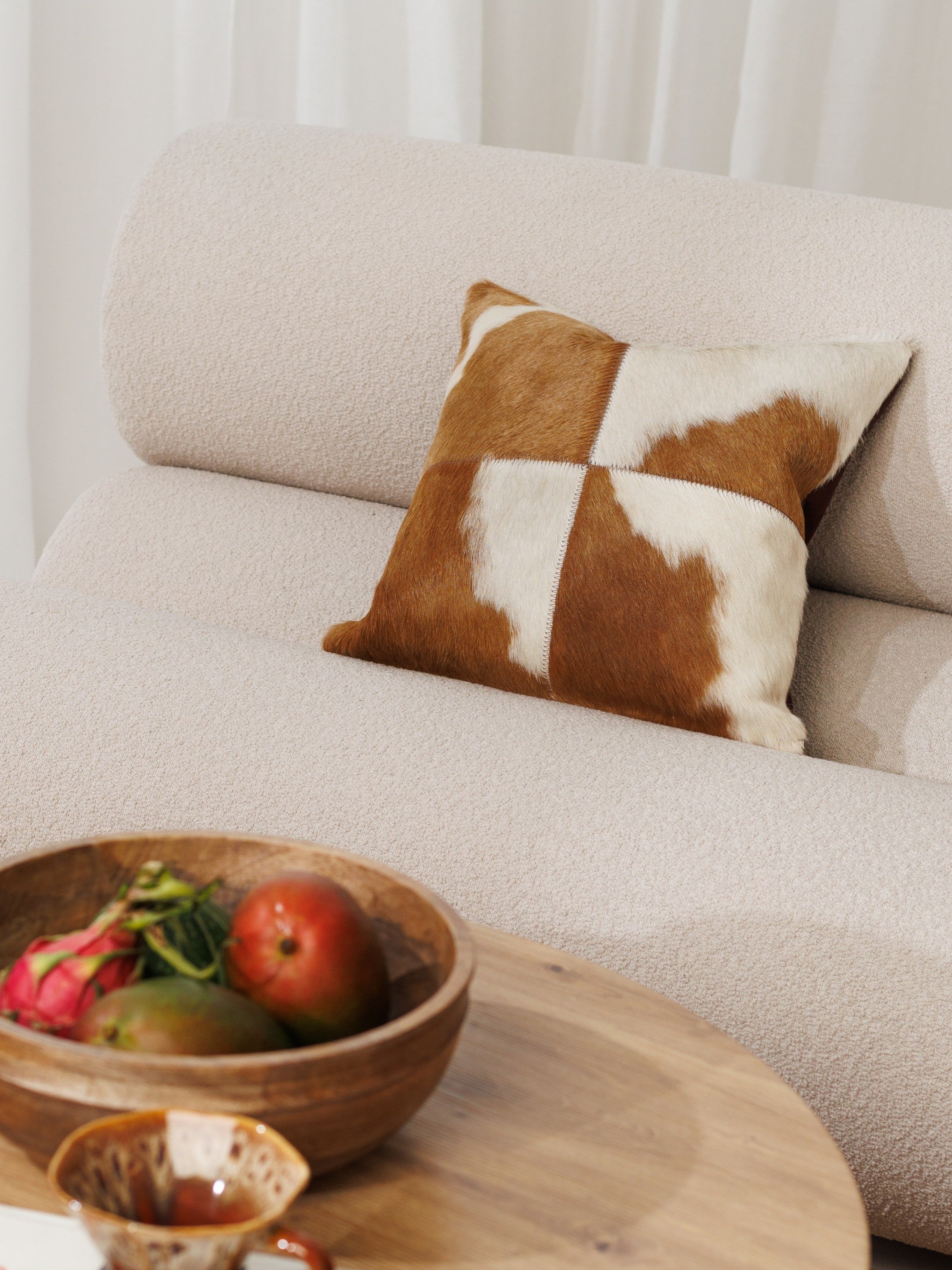 Hver pude kommer med en unik personlighed, takket være det håndlavede design med fire stykker ægte koskind. Det bløde og naturlige hår skaber sammen med de jordnære nuancer det perfekte indslag til hyggelige stuer, soveværelser eller afslappende opholdsrum.